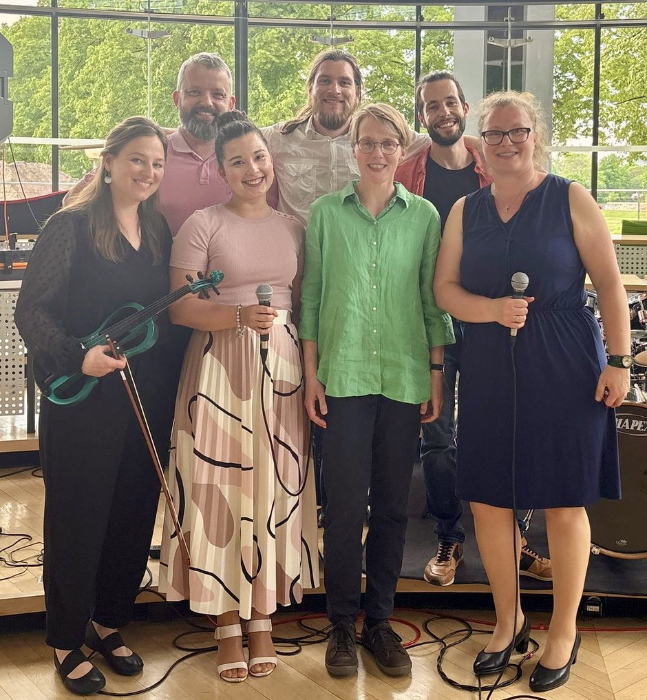 Frau Lang (E-Violine und Gesang), Herr Mieth (Klavier), Herr Reißig (Schlagzeug), Herr Wollny (E-Gitarre), Frau Schädlich (E-Gitarre und Gesang), Frau Kaufner-Marx (Bass) & Frau L. Hofmann (Gesang) sind Teil der RoRo-Band und spielen donnerstags - von Amy Winehouse, Benson Boone und Depeche Mode bis Olivia Rodrigo, Nena oder Bonnie Tyler - es wird nicht langweilig und für Abwechslung ist gesorgt. :-)